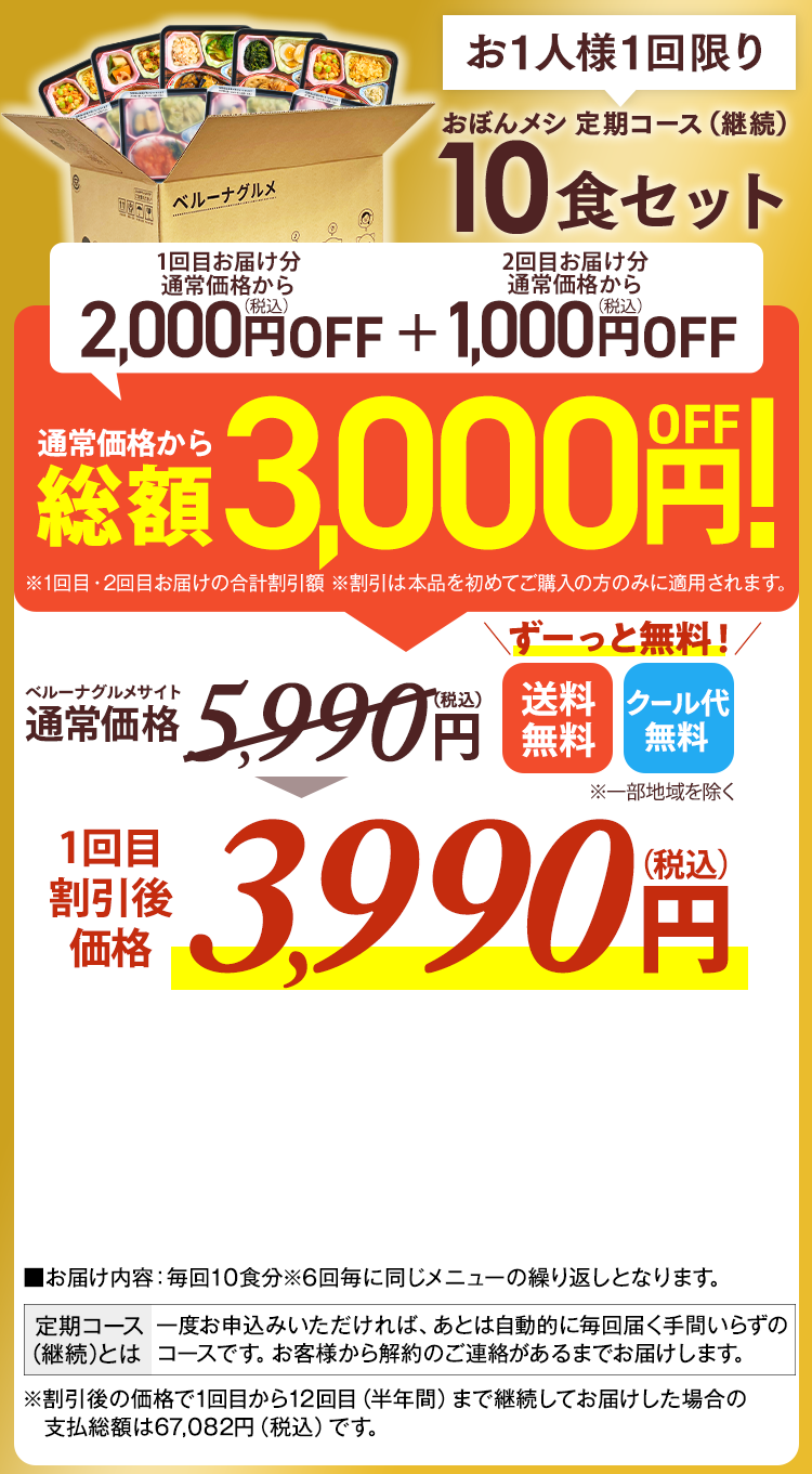 ※お一人様一回限り。※ベルーナグルメサイト通常価格から割引になります。※コースを1度解約して再度購入の場合は1回目・2回目の特別価格、「続けるほどお得割」は適用対象外になります。※スキップを行っても割引率は維持されます。※スキップ(お休み)は年3回まで※続けるほどお得割の詳細はこちら